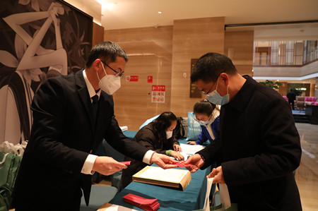 报到现场,委员们佩戴口罩,在工作人员的引导下,有序签到、领取材料。